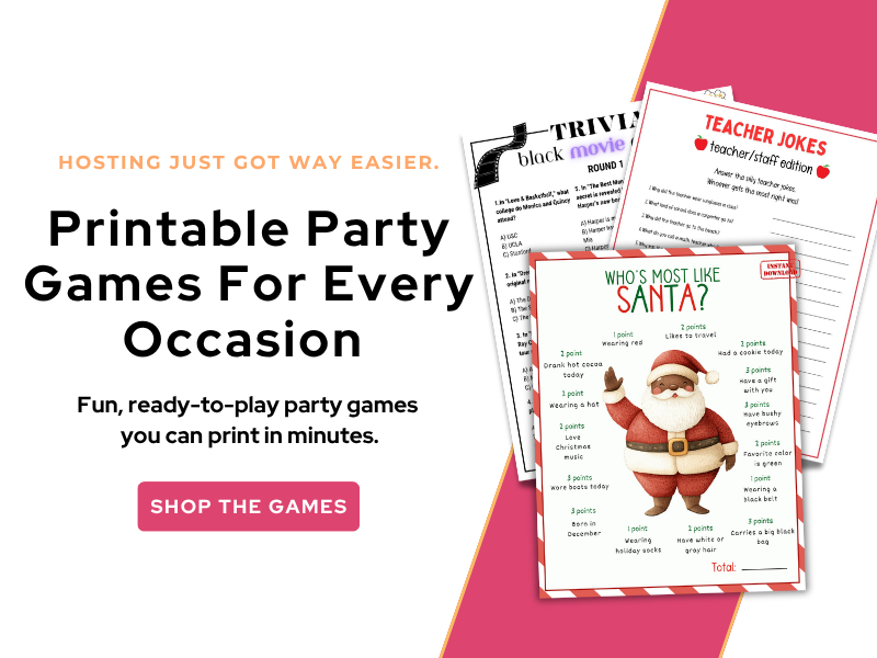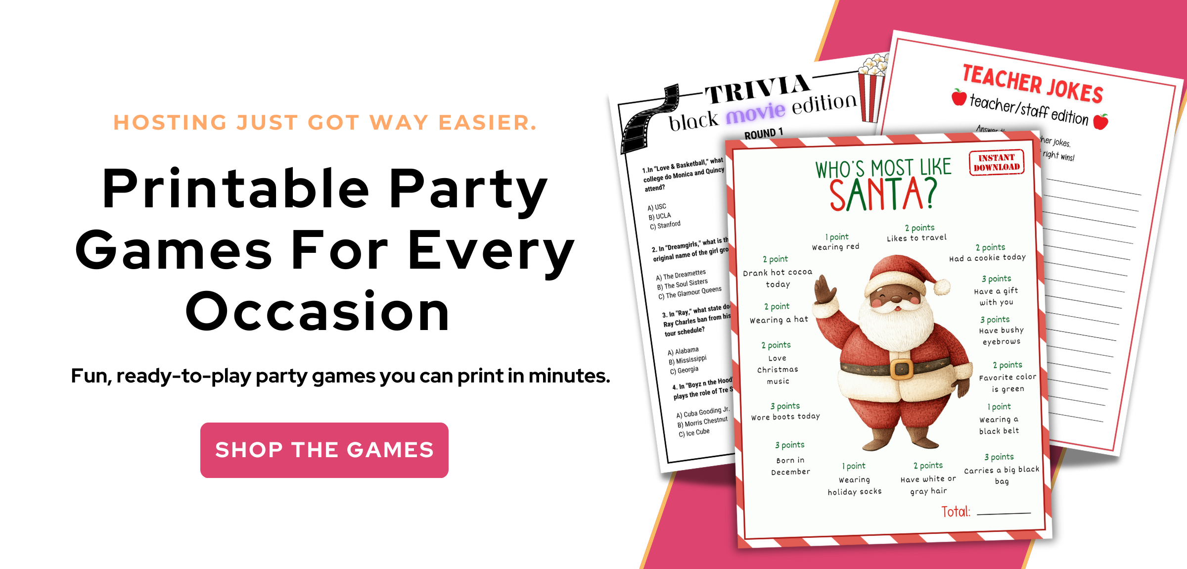 We create printable party games that turn any get-together into a moment. Whether it’s girls’ night in or a holiday dinner with the fam, our games spark connection, laughter, and those “remember when?” moments.