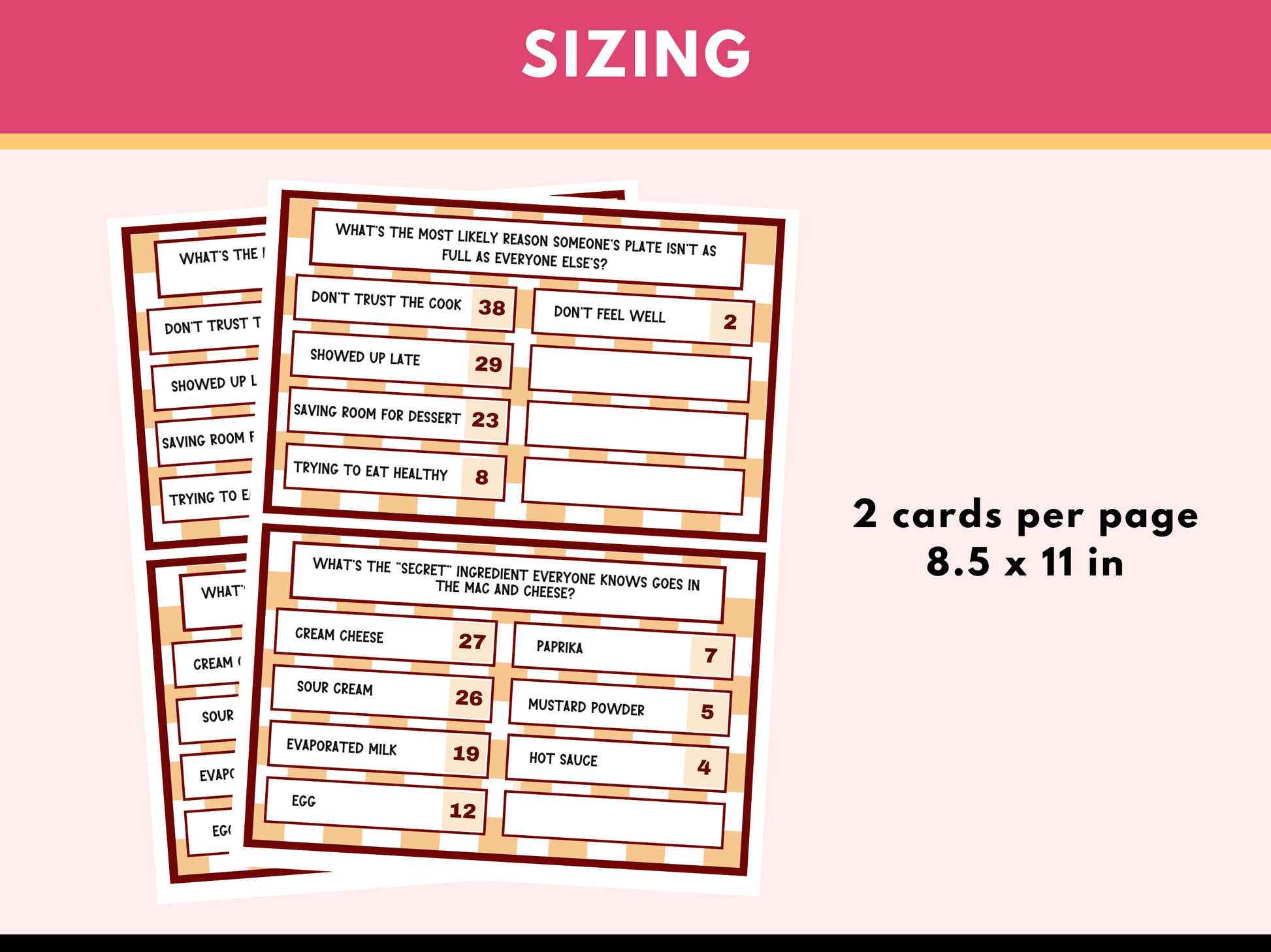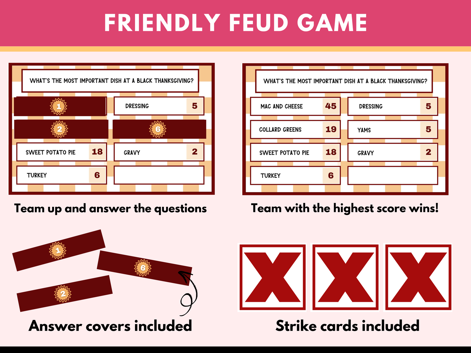 This Black People Friendsgiving Friendly Feud Game is great fun for this Thanksgiving! Perfect for bringing everyone together, this game is designed to celebrate and poke fun at all the classic moments that make Black family Thanksgivings unforgettable. Whether you’re playing with friends, family, or even co-workers, this game is sure to keep everyone entertained. This printable Thanksgiving game can be easily downloaded after purchase and printed out right at home or the office!